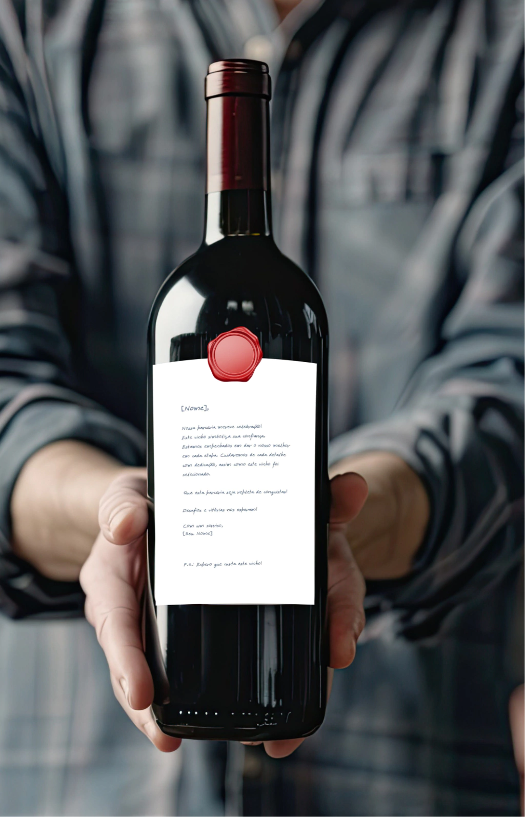 Surpreenda seus clientes e parceiros com um presente corporativo verdadeiramente único: um vinho premium com uma mensagem personalizada impressa diretamente no rótulo, como se fosse escrita à mão.